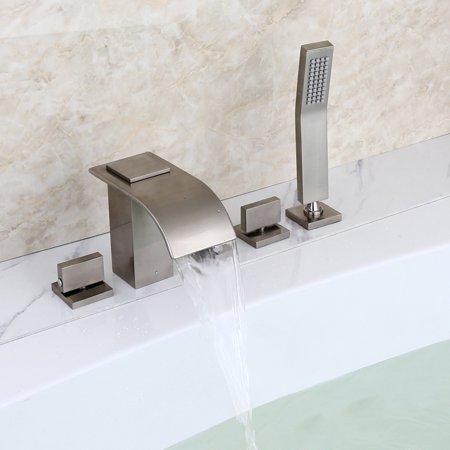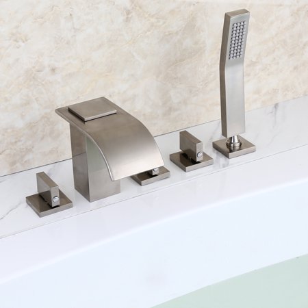 Wowkk waterfall roman tub faucets deck mount brushed nickel bathtub faucets brass tub filler bathroom faucets with hand shower. The double handle deck mounted roman tub faucet trim is the ultramodern choice in bathtub fixture designs. Faucet features a square base and carries those sleek lines throughout the arc of the faucet. Liked the roman tub faucet but the brushed nickel finish is different than the vanity faucet finish. In the event that you want for still bathroom faucets, at that point pull down is the best approach and, really, the best way to go!